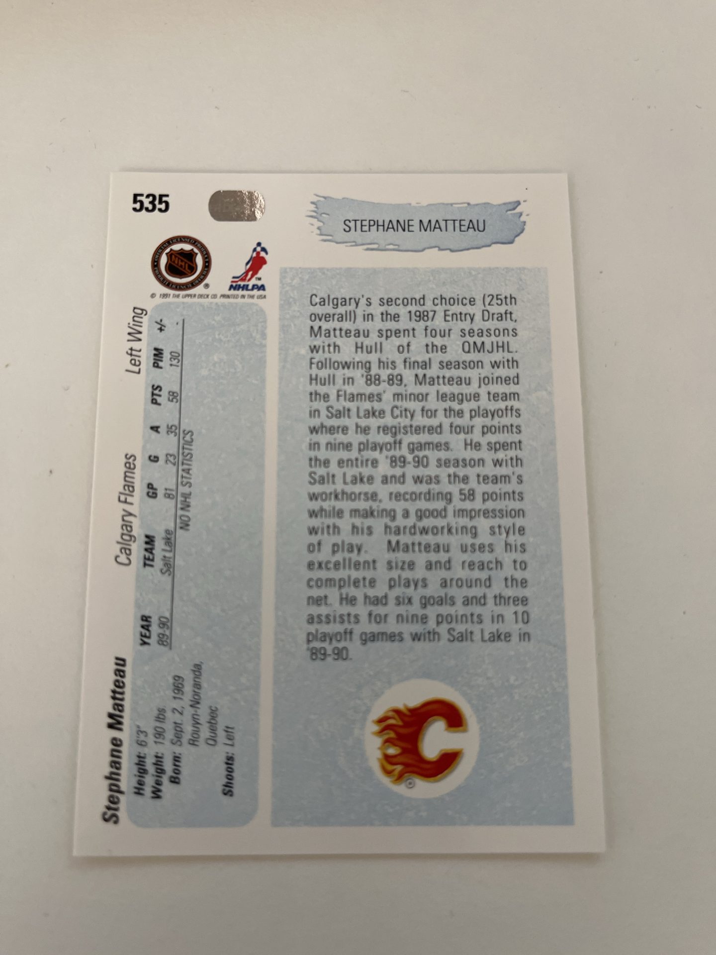 1990-1991 Upper Deck Stephane Matteau #535 Youbg Guns